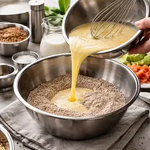 Prepare the dry mixture: in a large bowl, sift the buckwheat flour and wheat flour, add baking powder, sugar, and salt. Mix with a spoon or whisk to evenly distribute the ingredients. The dry mixture should be uniform, without lumps of flour.