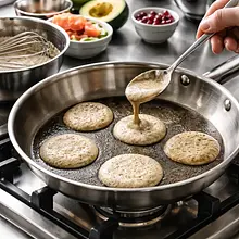 Fry mini pancakes: spoon portions of the batter onto a heated skillet, forming round mini pancakes with a diameter of 6-7 cm. Fry over medium heat for 1.5-2 minutes, until bubbles appear on the surface and the edges slightly darken. Flip with a spatula and fry the other side for 40-60 seconds, until golden.