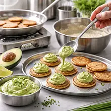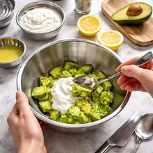 Prepare the cream: cut the avocado in half, remove the pit and scoop the flesh into a bowl. Add Greek yogurt, the juice of half a lime (about 15 ml), and 1/4 teaspoon of salt. Mash with a fork or blend with a mixer until smooth. Taste and adjust with lime juice, pepper, and possibly a bit of sugar if it's too sour.