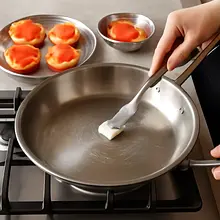 Heat a skillet over medium heat (about 3/6 on the burner scale). Lightly spread melted butter on one side of each slice (you can melt it in a small saucepan or in the microwave for 10–15 seconds). Place the slices butter-side down in the skillet and fry for 1–1.5 minutes, until the bottom is golden-brown and crispy. Flip the slices and fry the other side for 30–45 seconds. Alternatively: preheat the oven to 200°C and arrange the slices on a baking sheet, butter them, and bake for 4–6 minutes until golden.