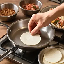 Warm the tortillas: heat a dry skillet (20-24 cm in diameter) over medium heat. Place one tortilla in the skillet and heat for 20-30 seconds on each side, until it starts to puff slightly and golden spots appear. Keep the tortillas wrapped in a clean cloth or aluminum foil to keep them soft and flexible. For serving, warm all the tortillas (about 12 pieces) — the whole process will take about 6-8 minutes.