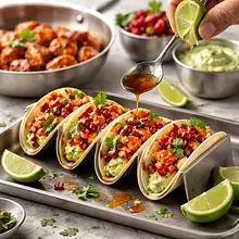 A seasonal, eye-catching fusion snack combining the Mexican form of mini tacos with Asian flavors of teriyaki-sriracha glaze. Tender, sweet-spicy salmon in a glossy glaze, creamy avocado with a tangy hint of lime, crunchy mini tortillas, and juicy pomegranate seeds create a contrast of textures and colors. This dish is perfect as a snack at a party, finger food at a cocktail party, or an appetizer during a gathering with friends — serve them right after preparation, garnished with fresh cilantro and sesame. Flavor notes: sweet-spicy glaze, creamy and fresh avocado-lime accent, the tartness of pickled onions and pomegranate cuts through the richness of the salmon; visually, the dish attracts with intense colors: the red of pomegranate, the green of avocado and cilantro, and the shine of the glaze.
