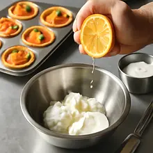 Use a small bowl and a spoon or whisk. If the cheese is very hard, take it out a few minutes before mixing to make it easier to combine. Taste the cream before filling the tartlets.