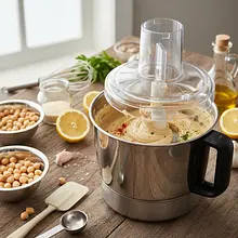 Blend all the ingredients into a smooth, uniform mixture. This process may take 2-3 minutes. If the hummus is too thick, gradually add very cold water, one tablespoon at a time, blending after each addition until you achieve the desired creamy consistency. Taste and season with salt or lemon juice if needed.