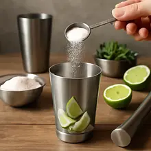 In each glass, place 15 g of sugar (about 1/4 of the prepared amount per glass) and 1 lime cut into quarters (a total of 4 quarters). Using a muddler or the end of a wooden spoon, vigorously but carefully muddle the lime with the sugar for about 20-30 seconds — the goal is to release the lime juice and partially dissolve the sugar, creating a thick, sweet-and-sour paste. Be careful not to overdo it with the force to avoid extracting too bitter essence from the peel.