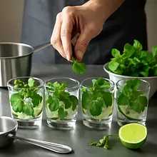 Mojito is a classic Cuban cocktail with a fresh, refreshing taste: a combination of sour lime, sweetness of sugar, aromatic mint, and white rum with sparkling soda water. It originates from Cuba and has been a symbol of summer lightness and party atmosphere for over a hundred years. The version prepared here for 4 servings is perfect for New Year's Eve 2025 — it is visually appealing, impressive, and easy to prepare in larger quantities. Serve in highball glasses with crushed ice, garnished with a sprig of mint and a slice of lime; it pairs wonderfully with tapas snacks, spicy Latin American dishes, and light salads. Its flavor profile features fresh mint in the foreground, pronounced acidity from the lime, subtle sweetness, and a warmer finish from the rum; visually, it attracts with the contrast of green and the clarity of the drink with the sparkling soda water.