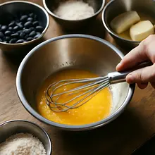 In a separate bowl, whisk the eggs (120 g) with a fork until smooth — about 20 seconds. Add natural yogurt (250 g), honey (60 g), melted, slightly cooled coconut oil (30 g), and vanilla extract (5 g). Mix with a whisk until the mixture is smooth and the honey is well dissolved.