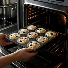 Place the mold in the preheated oven on the middle rack. Bake for 18-22 minutes at 180°C (if using convection, 170°C — 16-20 minutes). Check with a toothpick after 18 minutes: the toothpick inserted into the center of the muffin should come out dry or with a few moist crumbs, but not wet with raw batter.