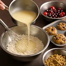 Pour the wet ingredients into the bowl with the dry ingredients in one stream, stirring simultaneously with a wooden spoon or silicone spatula. Mix only until the dry ingredients are moist — do not overmix. The batter should be thick but pourable; if it is very thick, add 1-2 tablespoons (15-30 ml) of milk.