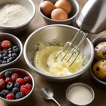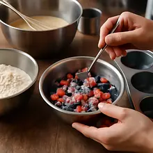 Gently mix the fruits with 1-2 tablespoons of flour (taken from the prepared portion) in a small bowl — dusting the fruits with flour will prevent them from sinking to the bottom during baking. Then add the fruits to the batter and gently fold them in with a spatula to avoid crushing the fruits (about 10-15 seconds).