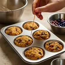 Check with a toothpick: insert a thin toothpick into the center of the muffin — if it comes out dry or with a few moist crumbs, the muffins are ready; if it comes out with raw batter, bake for another 2-4 minutes and check again. Remove the pan from the oven and let it sit for 5 minutes, then take the muffins out of the pan and transfer them to a wire rack to cool completely (about 20-30 minutes).