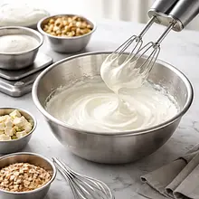 In a separate, clean bowl, whip the remaining 100 g of cream to soft peaks: first mix slowly for 30 seconds, then increase the speed and whip for 2–3 minutes until the peaks are soft, but the cream is not grainy. Check if the cream holds a slightly rounded shape when the whisk is lifted.