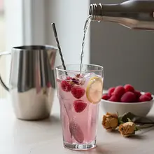 A refreshing and incredibly elegant lemonade that combines the sweetness of sun-ripened raspberries with a subtle floral note of rose water. It’s the perfect drink for hot summer days, garden parties, or special occasions when you want to serve something extraordinary. Its beautiful, deep pink color catches the eye and invites tasting. The lemonade is perfectly balanced – the sweetness of homemade raspberry syrup pairs wonderfully with the tartness of freshly squeezed lemon juice, while the delicate aroma of rose adds a refined character to the whole. Served with plenty of ice, fresh mint, and lemon slices, it not only tastes fantastic but also looks stunning. It can be prepared in a non-alcoholic version or enhanced with a splash of gin or prosecco, creating a light summer cocktail.