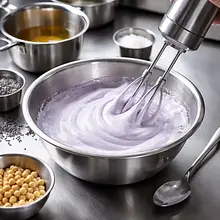 Prepare the meringue: chill 120 ml of aquafaba (in the fridge for at least 30 minutes before whipping). Pour the aquafaba into a tall, wide bowl and add 20-30 g of lavender syrup (according to your preferred sweetness). Whip with a hand mixer on the highest speed for 3-5 minutes — at first, you will see a foam with small bubbles, then it will become thicker and glossy. The meringue is ready when it can hold soft peaks (lifting the whisk leaves a shape that holds for a moment), usually 4-5 minutes.