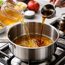 In a medium saucepan (20-22 cm in diameter), pour in the apple juice (300 ml), add the maple syrup (60 g), place 2 cinnamon sticks (10 g in total), sprigs of rosemary (6 g), and grated orange zest (5 g). Bring to a gentle boil over medium heat, stirring with a spoon to dissolve the syrup. Once the liquid starts to boil, place the prepared pear slices in the saucepan in a single even fan so that part is submerged. Reduce the heat to low and simmer very gently for 6-8 minutes — the pears should soften but retain their shape. You can check this by inserting a fork: the fork should go into the flesh with slight resistance, not break it apart.