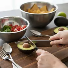 Przejdź do głównego składnika – awokado. Przekrój każde awokado wzdłuż na pół, obracając nóż wokół dużej pestki w środku. Złap połówki w dłonie i przekręć je w przeciwnych kierunkach, aby je rozdzielić. Aby usunąć pestkę, delikatnie, ale zdecydowanie wbij w nią ostrze noża i przekręć – pestka łatwo wyjdzie. Miąższ awokado wyjmij ze skórki za pomocą dużej łyżki i przełóż do średniej wielkości miski.