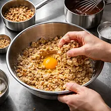 Form the dough: add the egg to the crumble and quickly knead by hand until combined — do not knead for long. The dough should be firm, not sticky; if it is too dry, add a teaspoon of cold water. Shape into a disc, wrap in plastic wrap, and chill in the refrigerator for at least 30 minutes.