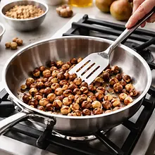 Toast the hazelnuts in a dry pan for 3–4 minutes until fragrant and the skin slightly cracks. Once cooled, roughly chop them. In the pan, melt 80 g of sugar over medium heat until it starts to caramelize to an amber color; add 40 g of butter and quickly mix. Remove from heat and add the chopped nuts and 2 g of salt; stir and spread on parchment paper to harden. Once set, break into irregular pieces.