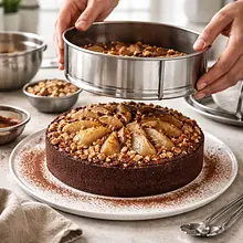 Remove the cake from the mold just before serving. Gently sprinkle cocoa on the edge of the plate and place the cake in the center. Crumble the salted nut crumble and sprinkle it in spots on the top and edges (do not cover the entire surface — it should create a contrast effect). Decorate with a few slices of toasted almond flakes. If there is leftover pear syrup, drizzle it on the edges or serve it in a separate jug for drizzling on each portion.
