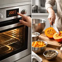 Preheat the oven to 200°C (top and bottom). Cut the pumpkin in half (if using hokkaido, you can bake it with the skin), remove the seeds with a spoon, and place the halves skin side down on a baking sheet lined with parchment paper. Bake for 35-45 minutes until the flesh is soft and a fork easily goes into it. After baking, set aside to cool slightly, then use a spoon to scoop out 500 g of soft flesh into a bowl.