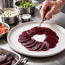 Preheat the oven to 200°C (top-bottom). Wash the beets thoroughly with a brush under running water, trim the roots and tails leaving about 1 cm of the stem (to prevent excessive juice leakage). Dry with a paper towel. Place the beets in a baking dish, drizzle with canola oil and evenly sprinkle with 2 g of salt. Cover the dish tightly with aluminum foil and place it in the oven. Bake for 50–60 minutes depending on the size of the bulbs — check with a wooden stick: it should slide into the beet smoothly without resistance. Once baked, set aside to cool (min. 20 minutes).