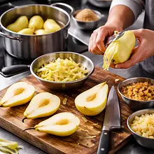 Prepare the pears: peel them thinly with a peeler, cut them in half lengthwise, and scoop out the seeds with a teaspoon. If you are using small pears, you can leave them whole and make a cut from the top. In a medium pot, combine 250 ml of water, 40 g of sugar, the scraped insides of a vanilla bean along with the empty pod (add the pod for flavor), and 1 teaspoon of cinnamon (about 2 g). Bring to a boil over medium heat.