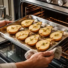 Preheat the oven to 190°C (top-bottom). Wash the pears, cut them in half, and remove the cores. Place a piece of butter (about 5 g) on each half and drizzle with a bit of honey (about 5 g per half). Arrange the pear halves on the baking sheet cut side up.
