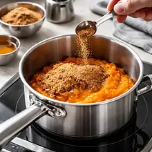Preheat the oven to 200°C (top and bottom). Cut the pumpkin in half, scoop out the seeds with a spoon, and cut the flesh into pieces. Place the pieces skin-side down on a baking sheet lined with parchment paper. Bake for 30–40 minutes, until the flesh is soft (check with a fork — it should go in smoothly). Remove and cool for 10–15 minutes, then scoop out the flesh and blend into a smooth puree in a blender or mash with a potato masher; weigh out 400 g of puree for the cream. If you are using store-bought puree, proceed to the next step.