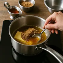 In a saucepan over low heat, place 150 g of butter, 150 g of brown sugar, and 100 g of honey. Heat while stirring with a wooden spoon until the butter melts and the sugar begins to dissolve (3–5 minutes). The mixture should be uniform and warmer than lukewarm, but not boiling. Remove from heat and let it sit for 5 minutes to cool slightly.