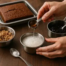 In a small bowl, mix 5 g of baking soda with 15 g of apple cider vinegar — it should start to foam and fizz. Wait 10–15 seconds for the reaction to subside slightly, then pour the mixture into the wet ingredients and mix quickly.