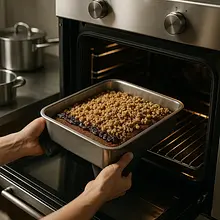 Place the pan in the preheated oven on the middle rack. Bake for 55–65 minutes at 170°C. After 45 minutes, check every 5–7 minutes with a toothpick: insert the toothpick into the highest point of the cake; it should come out with a few moist crumbs, but no raw batter. The top should be golden brown and springy to the touch.