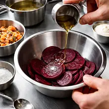 In a bowl, mix the beet slices with 10 g of rapeseed oil and a pinch of salt (about 0.5 g). Spread the slices in a single layer on a baking sheet lined with parchment paper, making sure they do not overlap. Bake on the middle rack for 35-45 minutes, gently turning them halfway through the time. The chips are ready when the edges slightly curl, and the center is dry and crispy. After baking, transfer to a rack to cool and become even crispier.