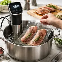 Check the temperature of the dish: the internal temperature of the duck breast after searing should be around 58–62°C (for medium). If you are serving family or people who prefer well-done meat, increase the sous-vide to 64–66°C or extend the roasting in the oven as an alternative.