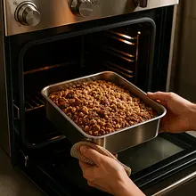 Place the pan in the preheated oven and bake at 175°C for 45–55 minutes. After 40 minutes, check with a toothpick: insert a thin wooden stick into the center of the cake — if it comes out with a few moist crumbs, the cake is ready; if it comes out coated with raw batter, bake for another 5–10 minutes. The topping should be golden.