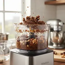 The best option is a food processor with an 'S' shaped blade. Pulsing (short, repeated cycles) gives you greater control over the degree of chopping. Be careful not to blend for too long, as the nuts will start to release oil and turn into peanut butter.
