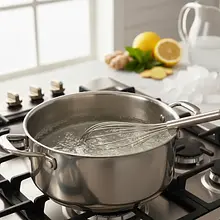 Heat the syrup, stirring constantly, until the erythritol is completely dissolved. You should obtain a clear liquid. As soon as the liquid starts to gently bubble (small bubbles will appear), reduce the heat to the minimum and cook for about 3-4 minutes to allow the ginger to release all its aroma. Then remove the saucepan from the heat and let it cool completely for about 15-20 minutes.