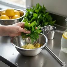 Take a bunch of fresh mint. Tear off about 20-30 of the prettiest leaves from the stems. Place them in your hand and 'wake up' the mint by clapping your other hand – this simple trick will bruise the leaves slightly and release an intense, refreshing aroma. Toss the 'awakened' mint leaves into the pitcher with lemon juice.