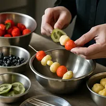 Start assembling the skewers: hold the stick in one hand and the fruit in the other. Alternate the fruits by color and texture, e.g. a piece of pineapple (2 cm) — grape — slice of kiwi (half) — piece of mango — half a strawberry — slice of banana — blueberry. Each skewer should have 6–7 pieces of fruit and not be too tightly packed. Time to assemble one skewer: 1.5–2 minutes; total for 8 skewers: 12–16 minutes.