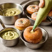 Preparation of pistachio paste: Preheat the oven to 170°C (without convection). Spread 200 g of pistachios on a baking sheet and roast for 8–10 minutes until they start to smell and lightly brown. Remove and let cool completely (about 15–20 minutes) — it is important that the blender does not heat them too much. Transfer the cooled pistachios to a food processor or a strong blender and blend initially in pulses, then continuously; occasionally scrape the mixture from the walls. First, pistachio flour will form, then a chunky paste, and finally a smooth, oily paste. The process may take 4–7 minutes depending on the device.