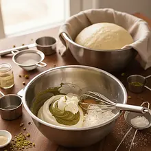 Start by activating the yeast. In a small saucepan, heat 100 ml of milk. It should be slightly warm, like bath water for a baby (about 35-37°C). Milk that is too hot will kill the yeast! In a medium bowl, crumble fresh yeast, add 1 tablespoon of sugar and 1 tablespoon of flour. Pour the warm milk over everything and gently mix with a fork until the ingredients combine into a smooth paste. Cover the bowl with a clean kitchen towel and set it in a warm, draft-free place (e.g., near a radiator or in a slightly warmed oven) for about 15 minutes. The prepared starter should double in volume and be covered with a thick foam. This is a sign that the yeast is active and ready to work.