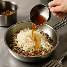 Add the chopped fresh mushrooms (200 g) to the pan and sauté for 6-8 minutes until they release their water and it evaporates, and the mushrooms are lightly browned. Then add the chopped soaked mushrooms (from step 1) and sauté together for 3-4 minutes.