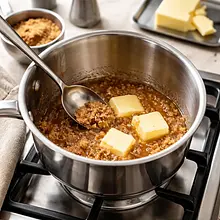 After serving, wash the tools used: immediately soak the baking tray and the baking dish to make it easier to remove the caramel residue. Store the remaining crumble in an airtight container at room temperature for up to 3 days — before reusing, you can lightly bake it to regain its crunchiness.