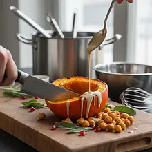 This dish is the essence of autumn on a plate, combining influences from European and Middle Eastern cuisine. Sweet, creamy roasted hokkaido pumpkin, whose skin becomes perfectly soft and edible after roasting, serves as the base for this composition. The crunchy, intensely spiced chickpeas provide a counterpoint to its delicacy, adding texture and satisfying depth to the dish. The whole is complemented by a velvety, nutty-lemon tahini sauce, which brings a hint of exoticism and balances the sweetness of the pumpkin. The ruby-red pomegranate seeds not only look beautiful but also burst in the mouth with refreshing acidity, while aromatic sage adds an earthy, herbal finish. The dish is visually striking – the combination of orange, red, green, and white creates a true work of art. It can be served as a standalone, hearty vegetarian or vegan dish, but also as an exquisite side to roasted meats, such as chicken or lamb.