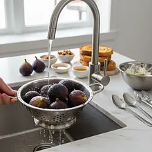 Rozgrzej piekarnik do 190°C (tryb góra-dół). W tym czasie przygotuj figi. Umyj je delikatnie pod zimną, bieżącą wodą i osusz ręcznikiem papierowym. Odetnij twardą końcówkę z ogonkiem. Następnie postaw figę pionowo na desce do krojenia i natnij ją ostrym nożem na krzyż, od góry, na głębokość około 2/3 owocu. Uważaj, aby nie przeciąć figi do końca – powinna tworzyć 'kwiatek', który można lekko rozchylić.