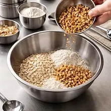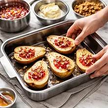 Preheat the oven to 180°C (top and bottom heat). Wash the pears, cut each in half lengthwise, and gently remove the seeds with a teaspoon, creating a small indentation in the center (do not scoop too deep to avoid cutting through the bottom). You can leave the skin on — it will add color during baking. Place the halves in a baking dish with the skin side down.
