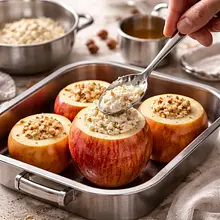 Place the dish in the preheated oven and bake the apples for 30-40 minutes at 190°C. After 20 minutes, check the softness: insert a wooden stick into the center of one apple from the side — it should go in easily, and the skin should be slightly wrinkled. If the stick encounters resistance, bake for another 5-10 minutes.