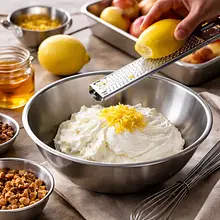 In a large bowl, place the ricotta (250 g) and Greek yogurt (120 g). Add the zest of half a lemon, the juice from the remaining half lemon (about 1 teaspoon), 15 g of honey (from 30 g), and 5 g of vanilla extract. Whisk or mix on low speed for 1-2 minutes until the cream becomes smooth and silky. Taste and optionally sweeten with an additional teaspoon of brown sugar if you prefer a sweeter cream.