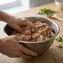 Knead the meat mixture with your hands for about 2-3 minutes, until all the ingredients are well combined and the mixture becomes uniform and sticky. Do not knead too long, or the meatballs will become tough. Wet your hands with cold water, take portions of the mixture (about one heaping tablespoon), and shape them into neat, even balls the size of a walnut. You should get about 16-20 meatballs.