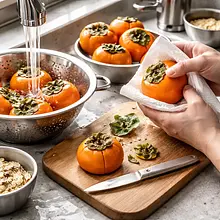 Place the tray in the preheated oven and bake the persimmons for 15–20 minutes. After 15 minutes, check the softness – the flesh should be soft when pressed with a teaspoon, the edges slightly golden and starting to caramelize. If you want deeper caramelization, turn on the top heating element for the last 2–3 minutes, watching to avoid burning.