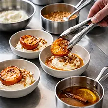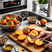 Preheat the oven to 200°C (top-bottom). Wash the persimmons, cut each in half lengthwise to maintain the "boat" shape. If seeds are present, gently remove them with a teaspoon. Place the halves cut side down on a baking sheet lined with parchment paper. Drizzle each half evenly with olive oil (about 1/2 teaspoon of oil per half), sprinkle very lightly with a pinch of salt and a bit of cinnamon (spread with your fingers). Place in the oven and bake for 18–22 minutes — the persimmons should soften, the edges will caramelize slightly, and their flesh will become glossier. After baking, let them sit for 5 minutes to cool enough to touch.